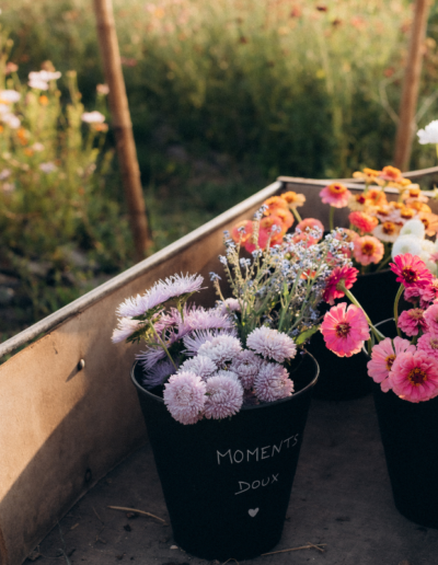 Une visite pour suivre les aventures de la graine au bouquet, une cueillette guidée pour en apprendre d’avantage sur les principes de la cueillette et cours d’art floral pour apprendre à confectionner son bouquet.