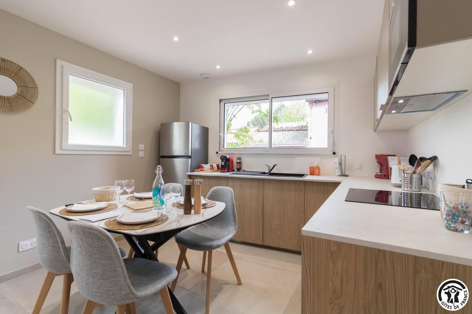 Ground floor: living room (fitted kitchen, dining area and sitting area), separate WC, utility room. First floor: 2 bedrooms (1 bed 160*200cm)(2 beds 90*200cm), shower room/WC. Reversible air conditioning in each room. Enclosed garden, terrace and barbecue. Private parking in front of the gîte.