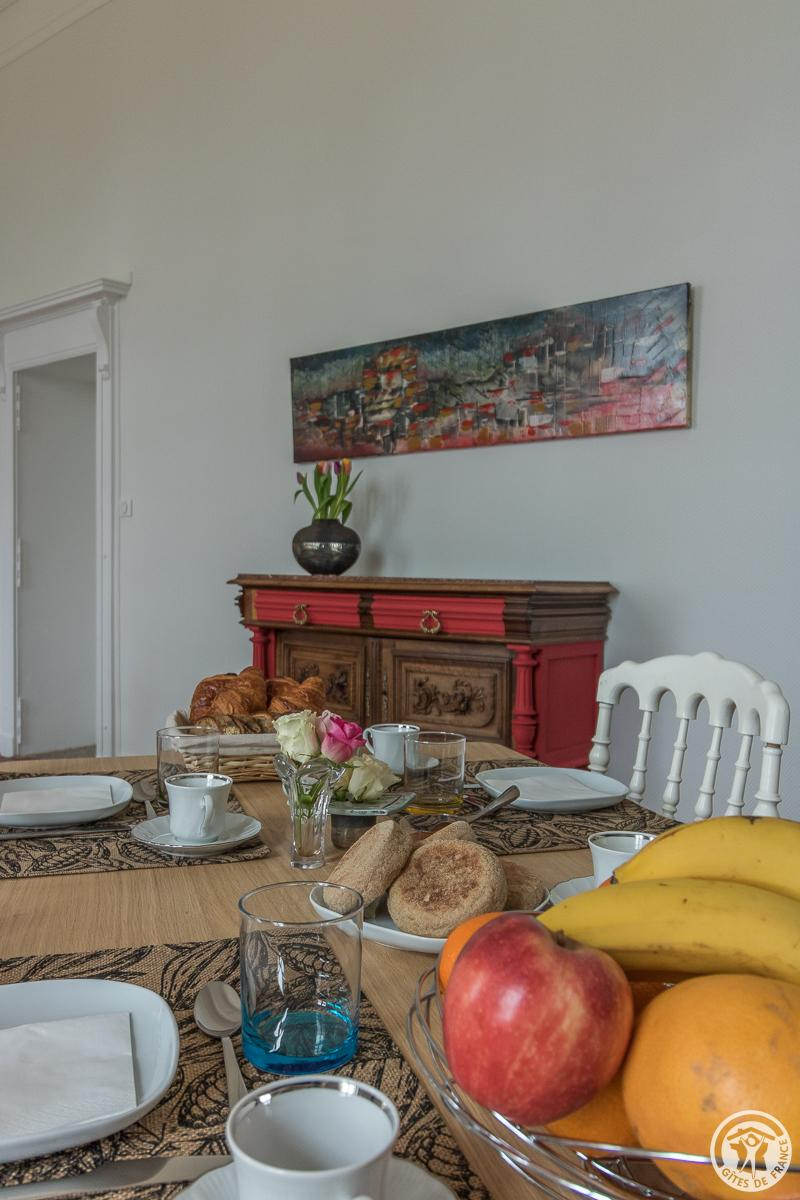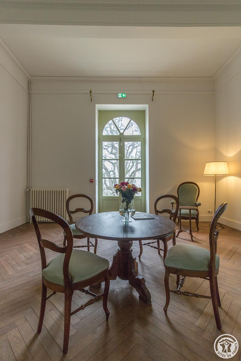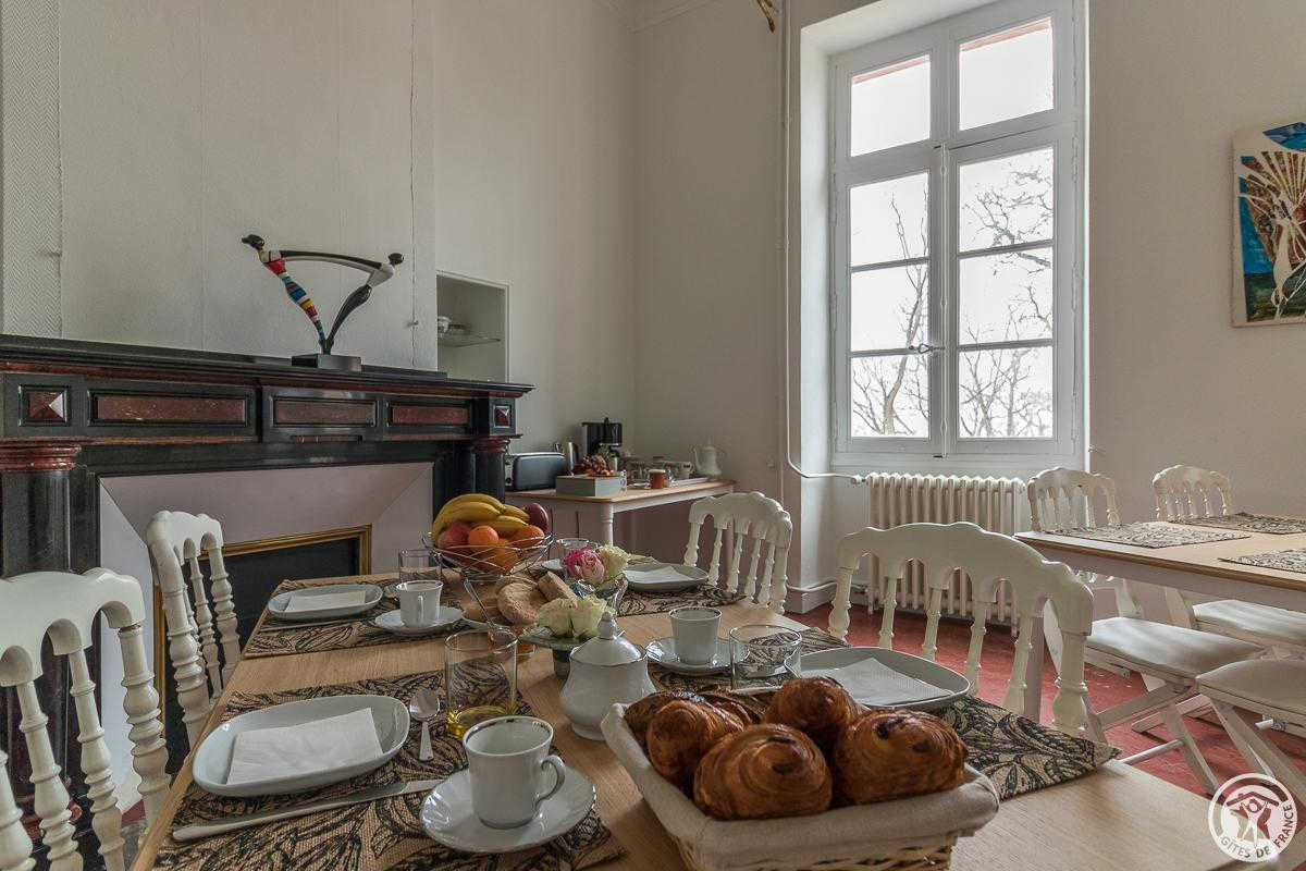 – En la planta baja del castillo: gran vestíbulo, cocina compartida con los propietarios (posibilidad de utilizar el frigorífico y recalentar sus comidas), sala de desayunos, pequeño salón, gran salón, salón de TV/biblioteca. Sanitarios comunes (3 WC, 1 de ellos accesible para personas con movilidad reducida).