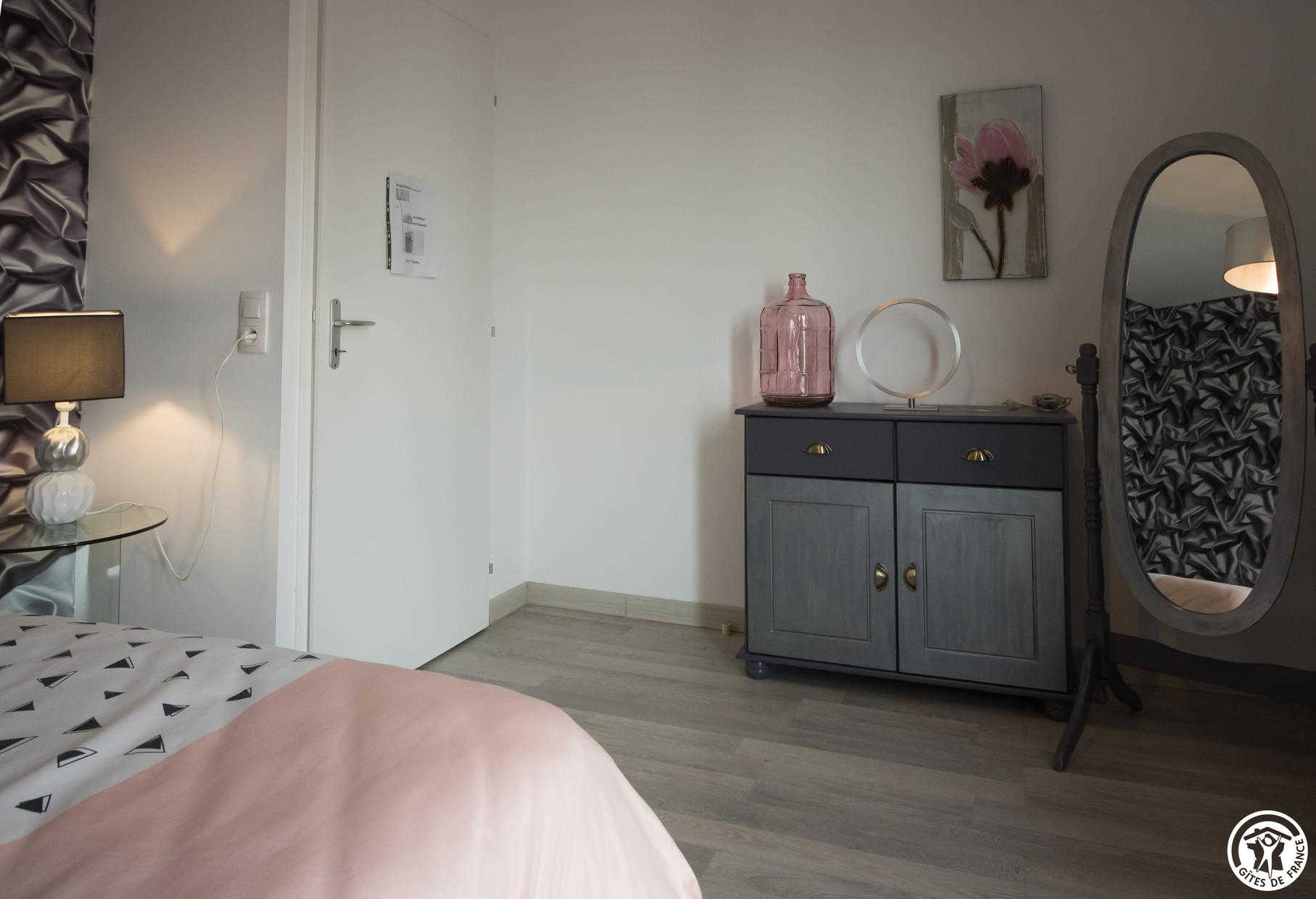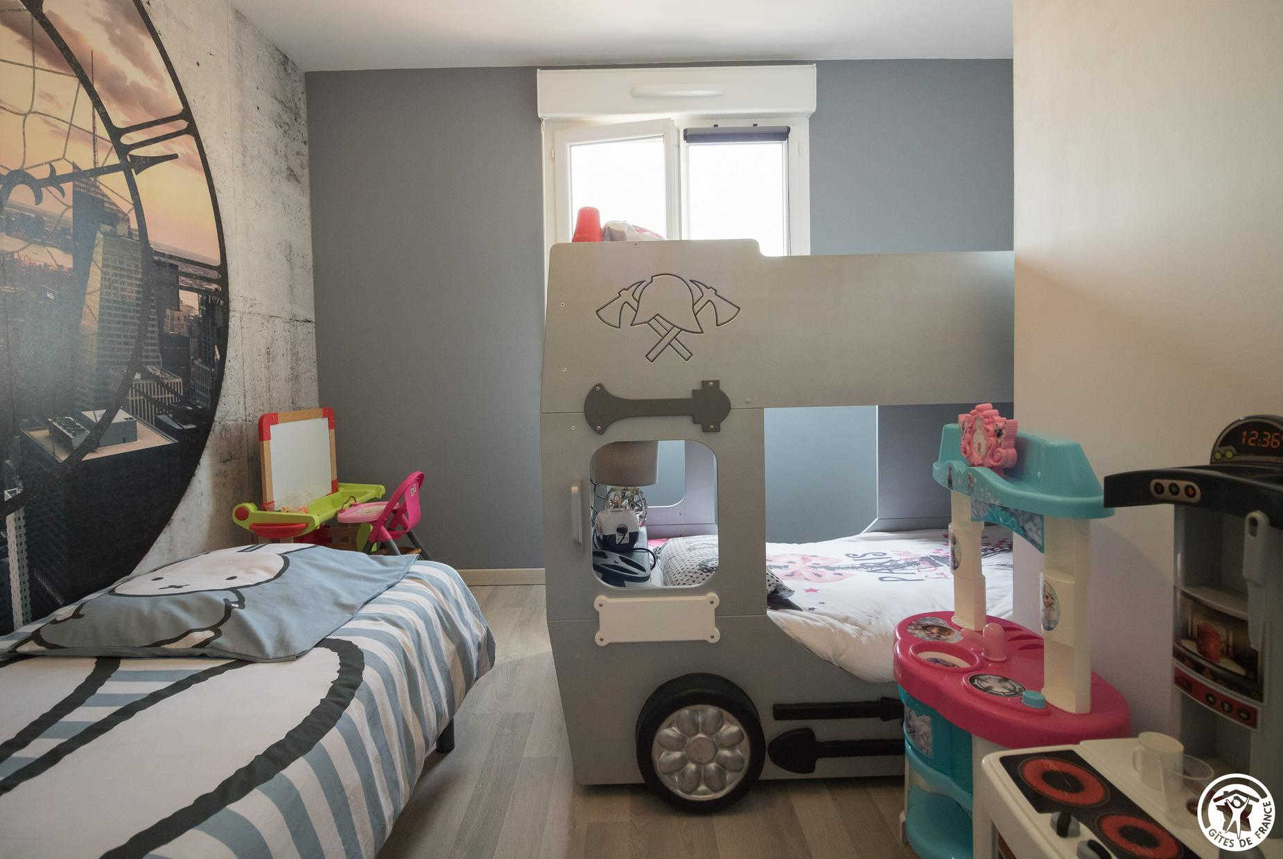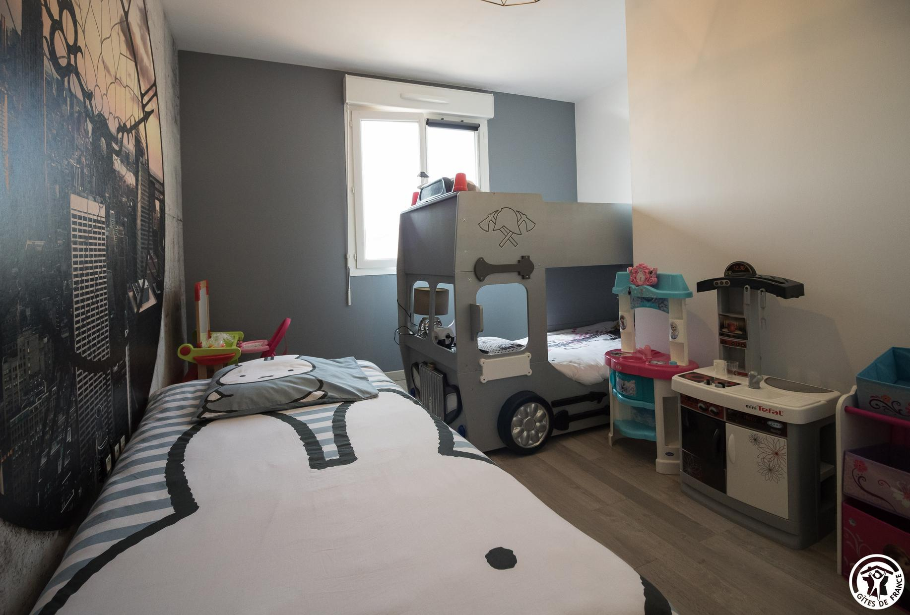 – Arriba: 3 habitaciones (1 cama doble de 140 cm) (1 cama doble de 140 cm con gran vestidor) (habitación de los niños: 1 cama individual de 90 cm y 2 literas individuales de 90 cm), cuarto de baño con WC.
