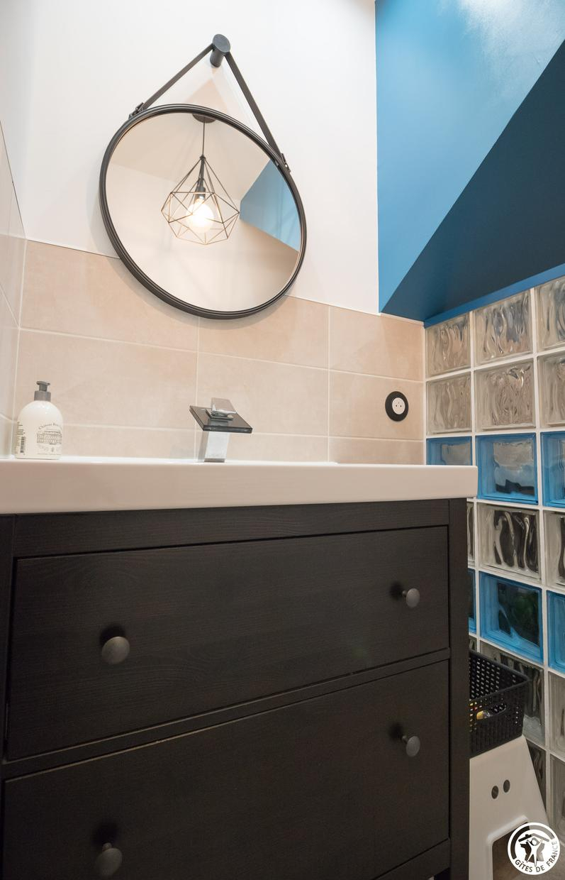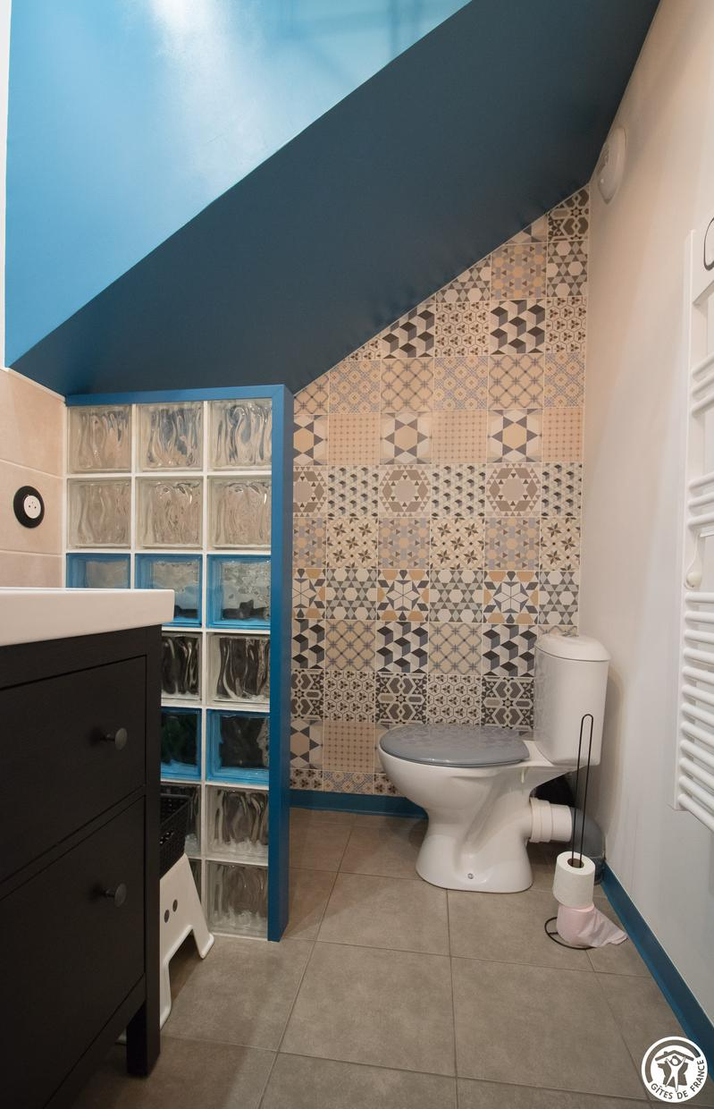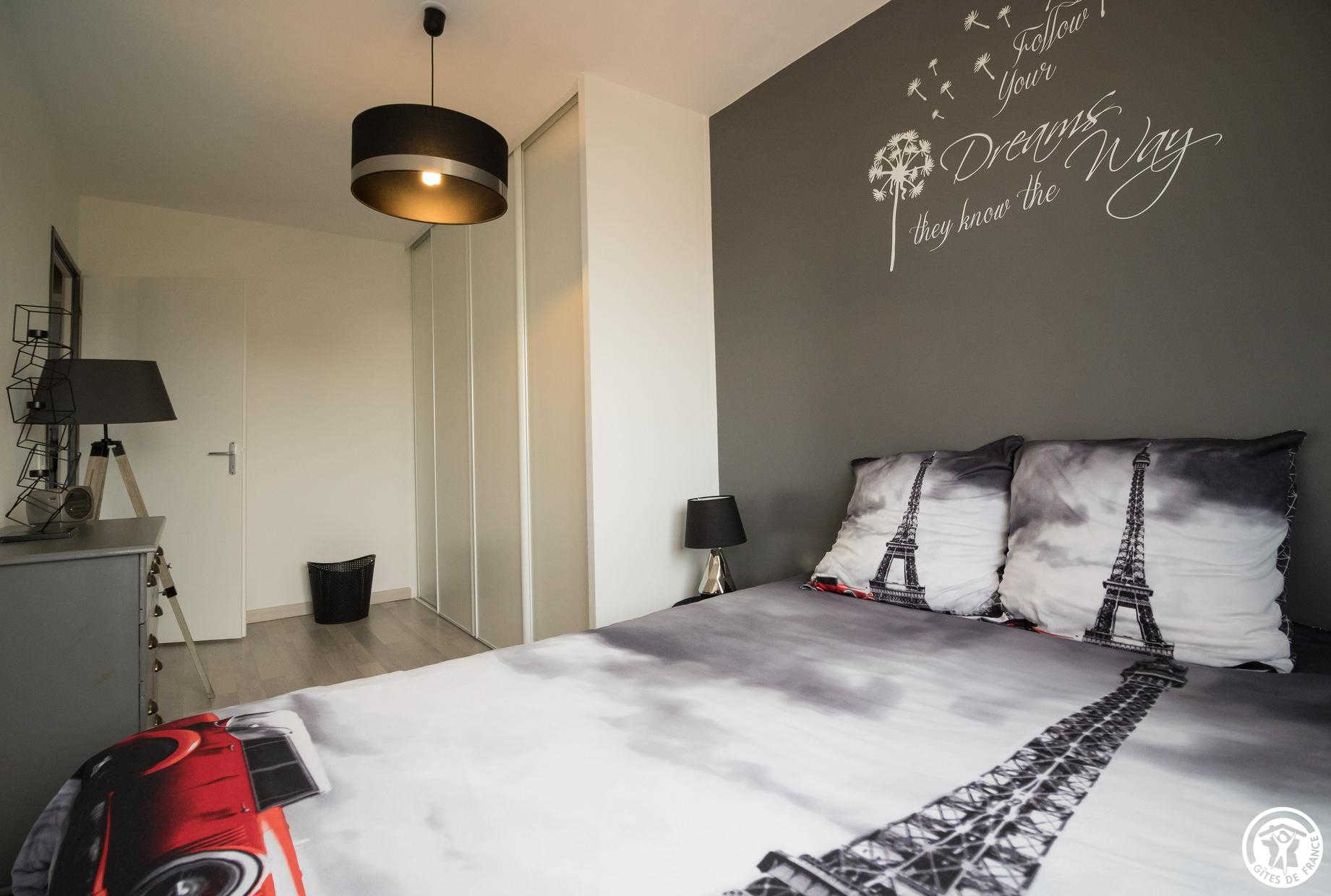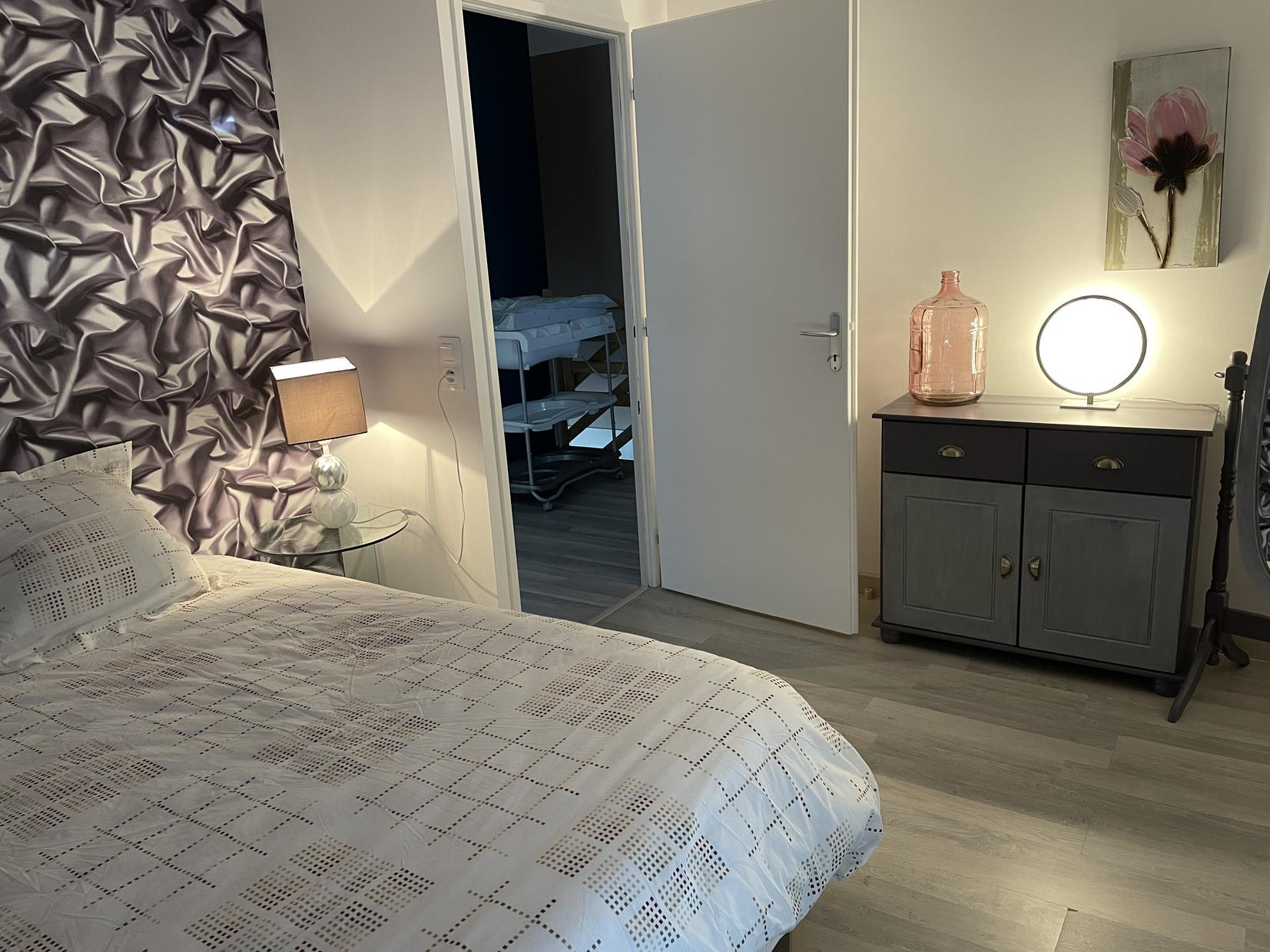– Arriba: 3 habitaciones (1 cama doble de 140 cm) (1 cama doble de 140 cm con gran vestidor) (habitación de los niños: 1 cama individual de 90 cm y 2 literas individuales de 90 cm), cuarto de baño con WC.