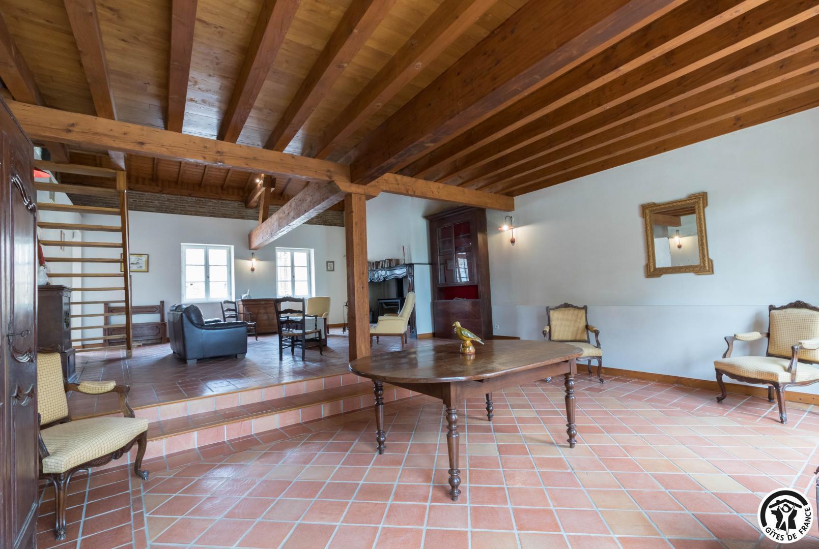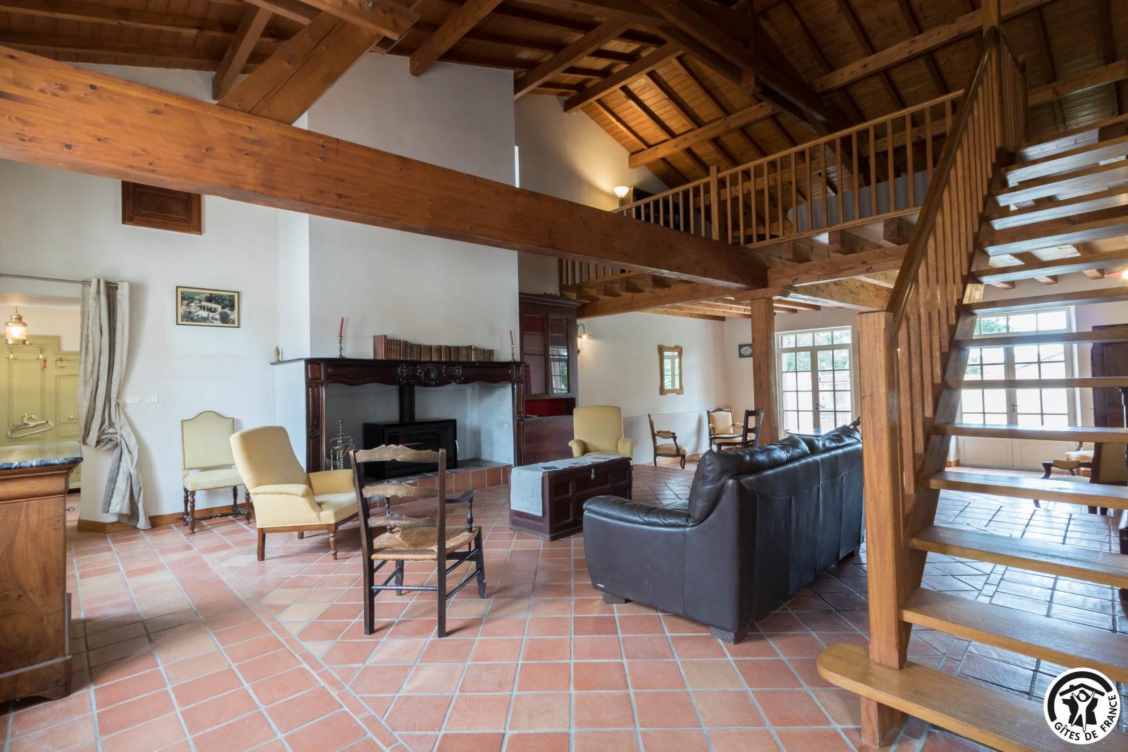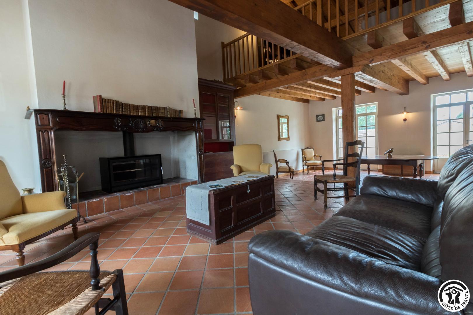 Gîte sur 2 niveaux : entrée depuis l’ancien pigeonnier, salon avec baby-foot et cheminée insert, cuisine/salle à manger (et arrière cuisine avec lave-linge et sèche-linge), 5 chambres (1 lit en 160*200cm)(2 lits en 90*190cm, jumelables)(3 lits en 90*190cm dont 2 superposés)(1 lit en 160*200cm)(1 lit en 140*190cm avec petite salle d’eau privative), salle de bains/WC et WC séparé. A l’étage : salon en mezzanine avec TV et bureau, et chambre (1 lit en 140*190cm). Piscine commune en 12*5, clôturée et ouverte de mi juin à mi septembre. Les propriétaires vivent dans la partie principale du Château, vous partagez le parc avec eux.