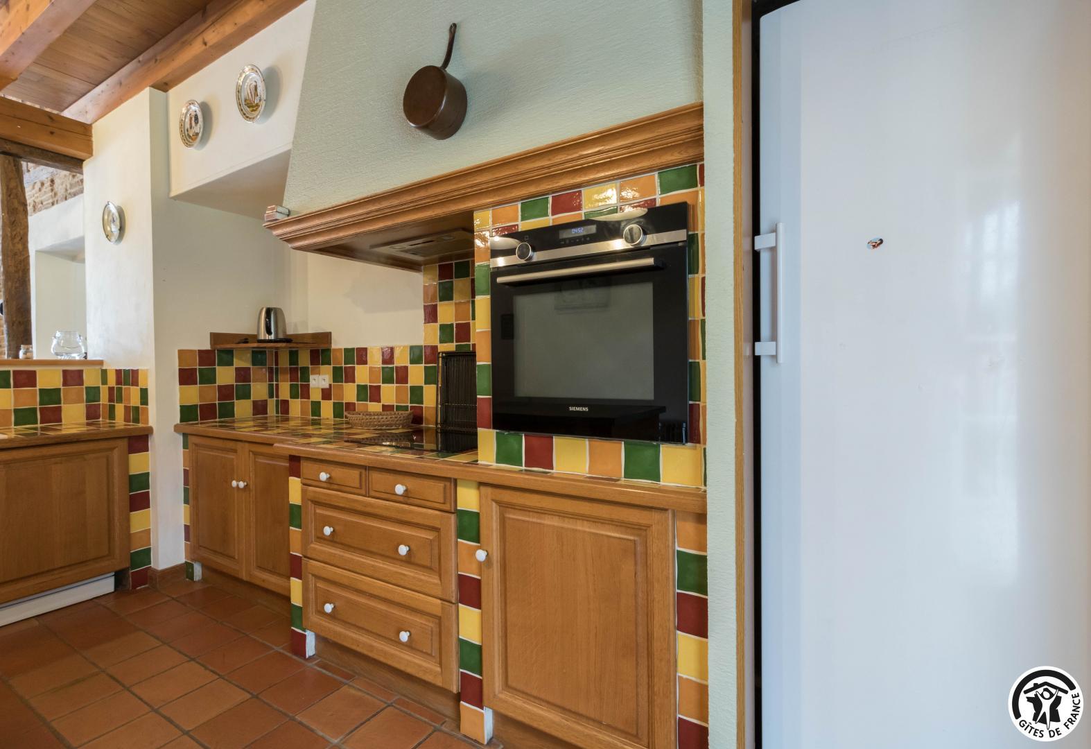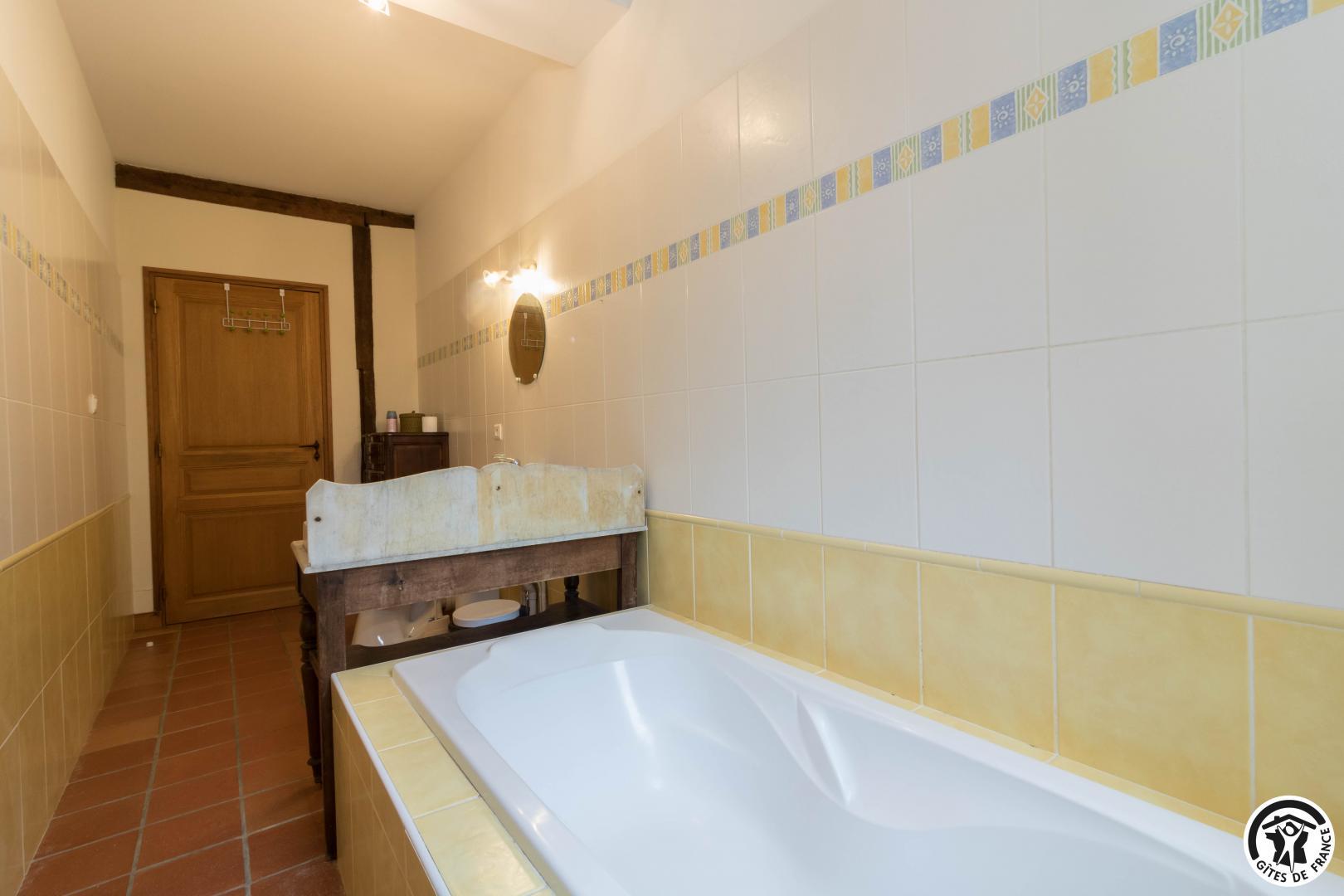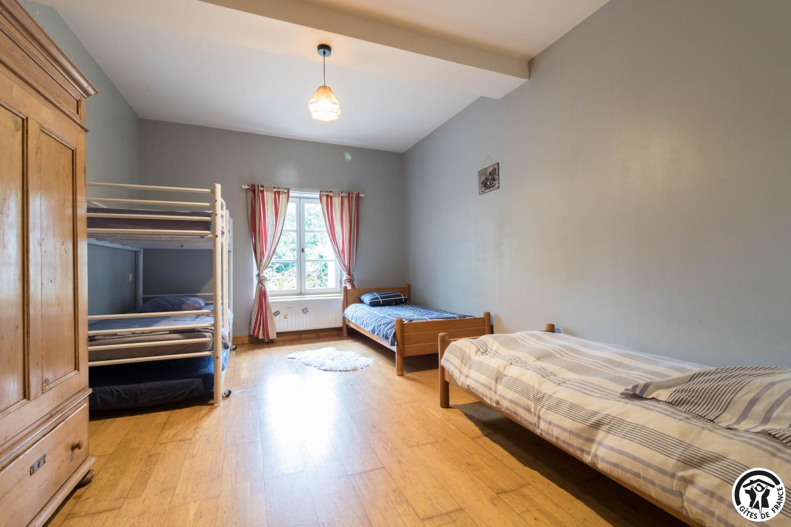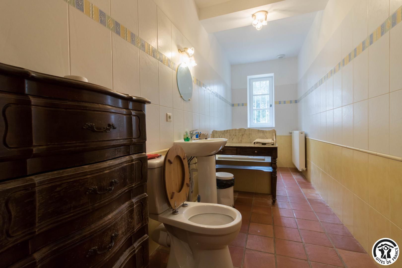 Gîte sur 2 niveaux : entrée depuis l’ancien pigeonnier, salon avec baby-foot et cheminée insert, cuisine/salle à manger (et arrière cuisine avec lave-linge et sèche-linge), 5 chambres (1 lit en 160*200cm)(2 lits en 90*190cm, jumelables)(3 lits en 90*190cm dont 2 superposés)(1 lit en 160*200cm)(1 lit en 140*190cm avec petite salle d’eau privative), salle de bains/WC et WC séparé. A l’étage : salon en mezzanine avec TV et bureau, et chambre (1 lit en 140*190cm). Piscine commune en 12*5, clôturée et ouverte de mi juin à mi septembre. Les propriétaires vivent dans la partie principale du Château, vous partagez le parc avec eux.