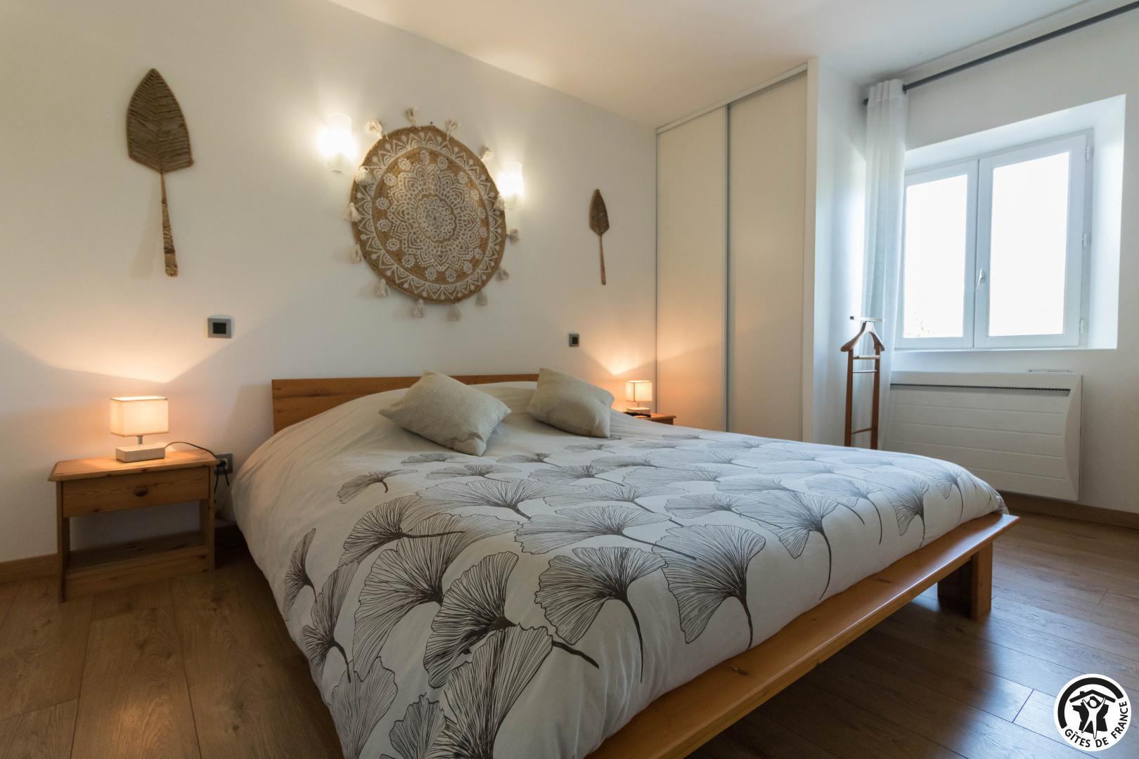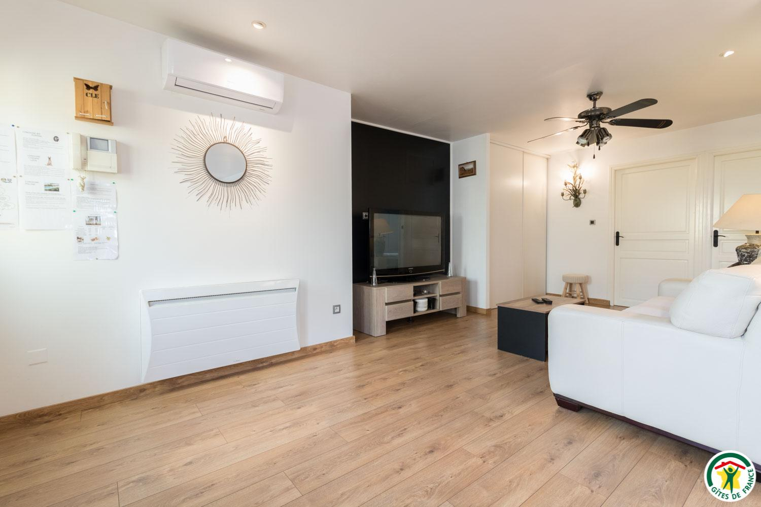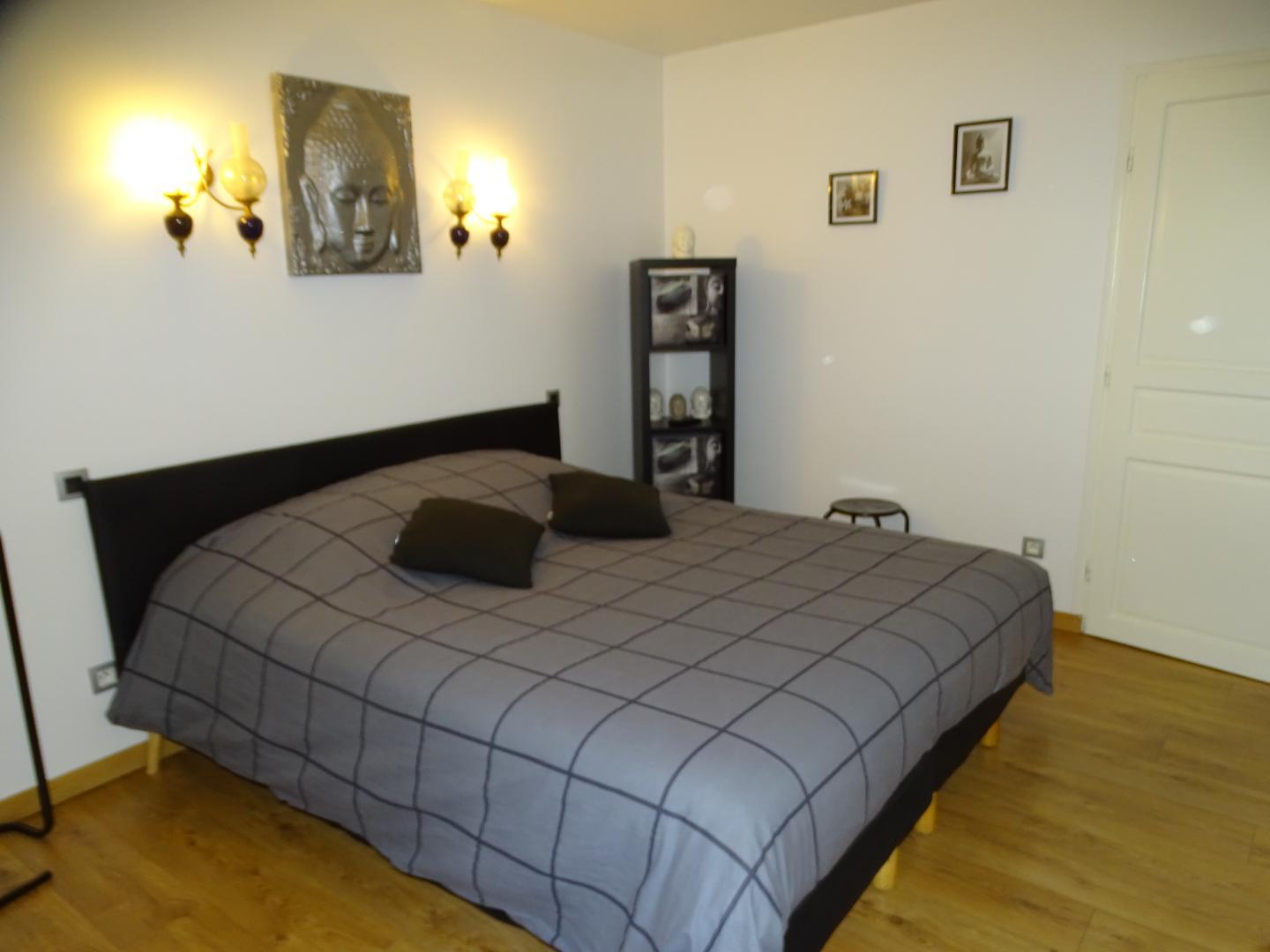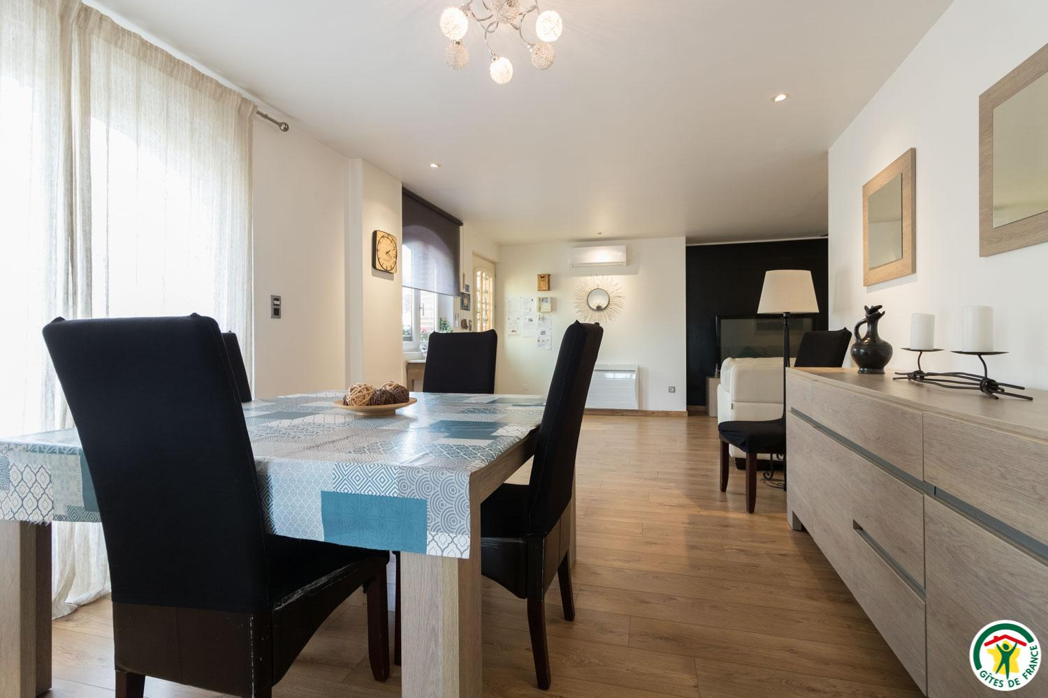 Gîte de plain-pied de 90m2 : vaste séjour de 53m2 composé d’un salon avec TV écran plat de 200cm (lecteur DVD) et un canapé (climatisation), d’une salle à manger et d’une cuisine. La cuisine donne sur la terrasse (salon de jardin et salon de détente) où vous profiterez d’une vue exceptionnelle sur la piscine, le SPA (en supplément) et le jardin. Depuis le séjour, vous aurez accès à la chambre Zen avec 2 lits simples en 80*200cm, jumelables en 1 lit double en 160*200. Une deuxième chambre, la Campagne (1 lit pour 2 personnes en 160*200cm), est accessible depuis la chambre Zen ou la salle d’eau. WC indépendant. Sèche-linge chez la propriétaire.