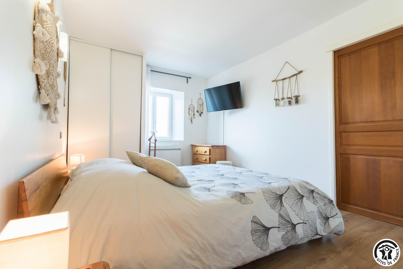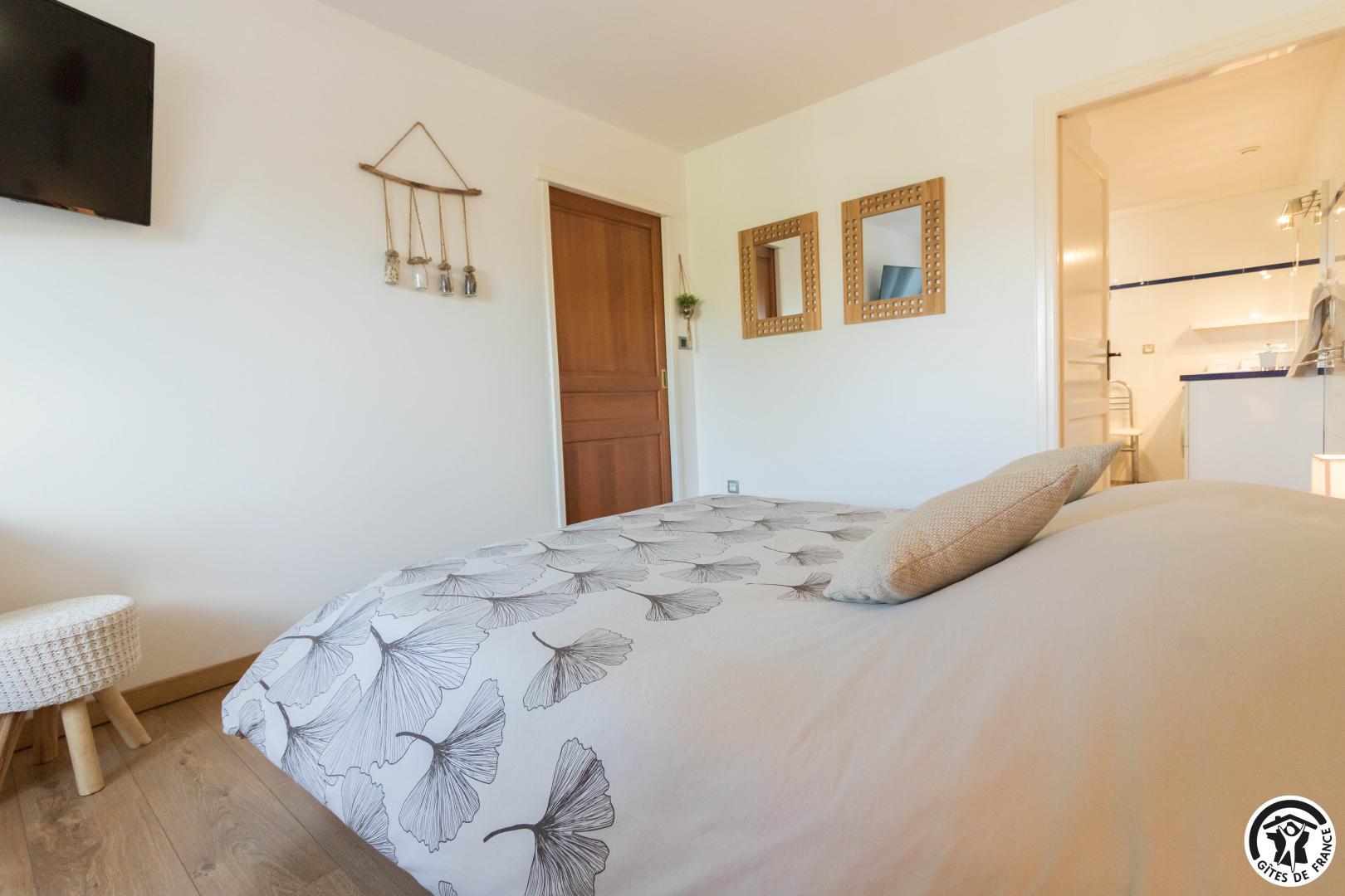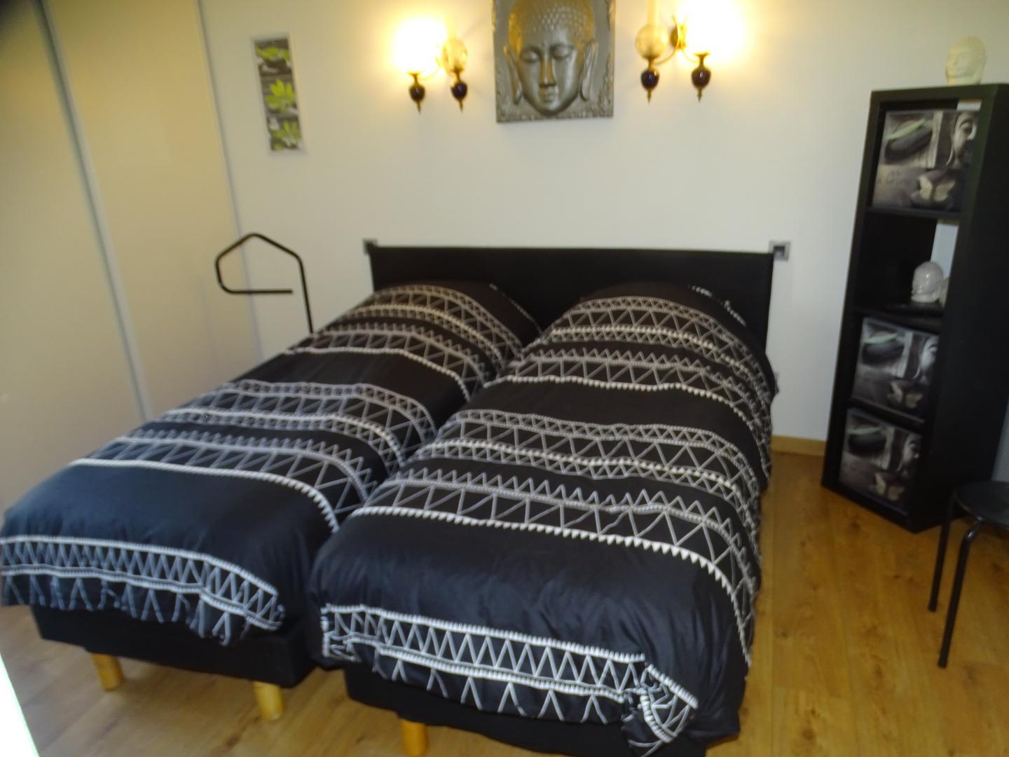 Gîte de plain-pied de 90m2 : vaste séjour de 53m2 composé d’un salon avec TV écran plat de 200cm (lecteur DVD) et un canapé (climatisation), d’une salle à manger et d’une cuisine. La cuisine donne sur la terrasse (salon de jardin et salon de détente) où vous profiterez d’une vue exceptionnelle sur la piscine, le SPA (en supplément) et le jardin. Depuis le séjour, vous aurez accès à la chambre Zen avec 2 lits simples en 80*200cm, jumelables en 1 lit double en 160*200. Une deuxième chambre, la Campagne (1 lit pour 2 personnes en 160*200cm), est accessible depuis la chambre Zen ou la salle d’eau. WC indépendant. Sèche-linge chez la propriétaire.