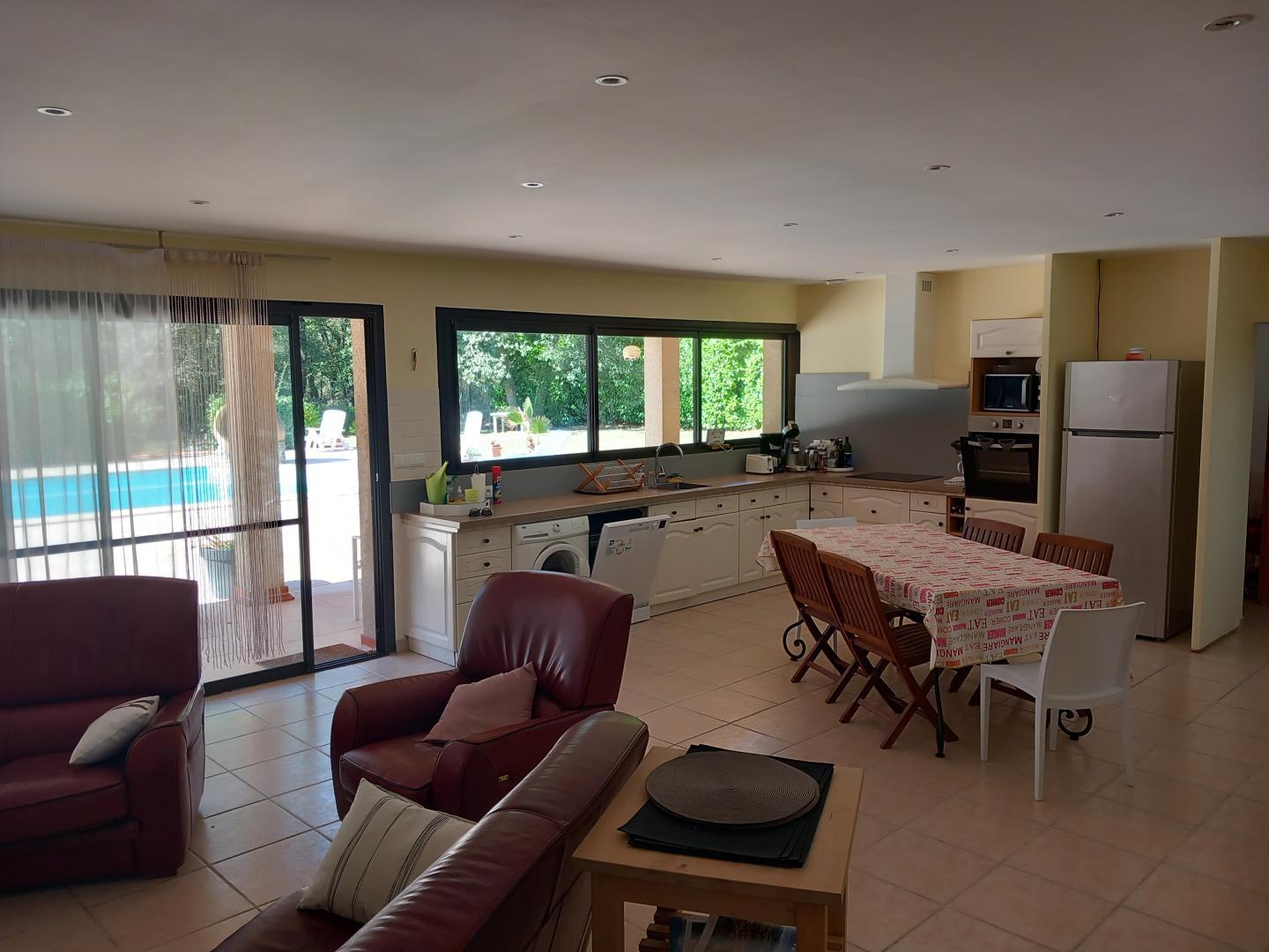 Les baies vitrées du séjour sont un apport de lumière exceptionnel et une ouverture sur la piscine.